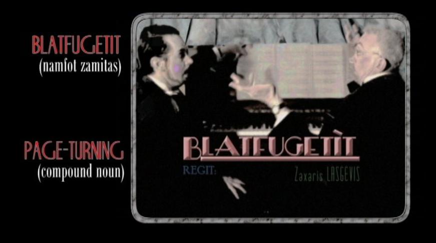 This film is essentially a stylized lesson in Disfodish, revealing important verbal structures and the similarity of two verbs which refer to contrasting aspects of the function being presented in the film: piano playing and pleasure. ‘ZIZBILET’ is a reflexive verb which can be used to refer to the playing of instruments; ZIBLIZIT, in comparison, is a noun which refers to ‘self-pleasure’ or ‘masturbation’.