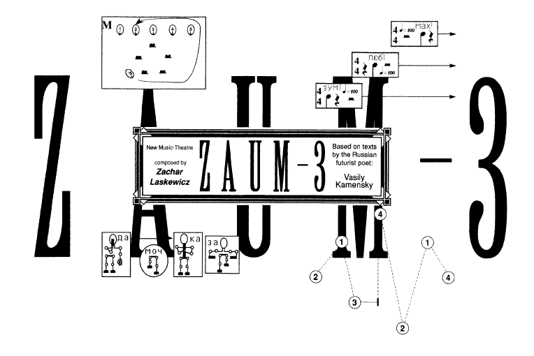 Vasily Kamensky (1884-1961) played an important role as a Russian futurist, being responsible for the development and elaboration of certain avant-garde poetic techniques.Following the premises of Russian cubo-futurism, he attempted to break down language and reconstruct it in a totally new form.He became interested in phonic instrumentation, and in particular with the possibilities offered by onomatopoeic procedures:here a melodic line came increasingly to prevail. The structure of the third movement, in adopting some of the attitudes to language characteristic of Kamensky, uses the structures and rhythms behind text to structure the musical development within the composition, reminiscent of Indian dance 'spoken' through the rhythmic nature of the words: musical structures continually result in the formation of the text just as the reciting of the text results in the creation of musical structures and movement patterns.There is also an emphasis in this section on exploring more completely the role that 'movement' plays in the creation of music; the natural physicality of music expressed through playing an instrument or conducting.This can be related to a relatively new form of Balinese dance called Kebyar Duduk that uses the 'physicality' of instrument-playing to structure the dance.The dance itself evolved from the physical process required to play the trompong, where the length of the instrument itself necessitated the player to move from one end to the other, and as such was usually played by two performers.The originator of Kebyar Duduk wanted to play this instrument alone and thus invented a large number of stylized movements that would allow him to reach from one end to the other.This performance became independent of the instrument and recognised as a dance in its own right, although the dancer in Kebyar Duduk can still be seen as "an instrument, not as a person."[1]The physicality of instrument playing is also suggested by musical teaching methods adopted in Africa.Here, patterns of movements are imparted 'physically' by the teacher to the pupil, for instance by a teacher holding his pupil's hand and imparting direct impulses to them until the pupil has absorbed the movement pattern and his hands holding the sticks are moved at the correct instant.[2]The intention in Zaum-3 is therefore to extend musical discourse into a physical dimension, where movement patterns are related directly to musical lines.The performers on stage are used to express this relationship between sound and movement, resulting in the creation of a 'dance/movement language'.Zaum-3 is divided into three sections;(i) Ensemble, (ii) Chorus, (iii) Finale.Section 1:EnsembleThis section begins with a 'phantom' ensemble that forms on stage where the existence of large and grotesque musicalinstruments is suggested by the exaggerated movements of the performers.The sounds themselves are heard from a recording, and are actually vocal sounds of the same five performers.Movements and sounds emerging from these invisible 'instruments' are echoed at all times by a performer standing before the ensemble and taking the role of a conductor: he/she gives stylized gestures that seem to have some controlling connection with the sounds and movements.Section 2:ChorusThe 'musicians' vacate the central space leaving the conductor alone who is facing away from the audience.This performer moves under a spotlight which comes up in the centre of the stage, turns around, bows to the audience, and then begins to 'perform' movement-texts which are spoken by the chorus now surrounding the performance area.The function of this section is to introduce and develop the basic elements of the 'dance-language' that will structure the finale.The texts used are based on a completely 'meaningless' (translatable only as sounds) but rhythmically and texturally exciting sound poem by Kamensky.Here the zaum words are brought to life by performing the rhythmic passages as flowing movement patterns and the sounds of single syllables as sharp gestures.Much of this movement material has already appeared in Zaum-1 and Zaum-2, although it is presented here in a further developed form.A recitation of the poem is followed by a number of developments of the same text suggesting alternative ways of presenting dance languages, leading finally to the performance of two 'dance sentences' growing directly from Kamensky's poem.These dance sentences are used as the basis for the concluding section.Comparable to forms of Indian temple dance, this small vocabulary of rhythmic vocal sounds structures time in such a way that the movement andmusical compositions can simultaneously develop, inseparably intertwined.Overleaf is the original poem by Kamensky followed by the dance sentences.