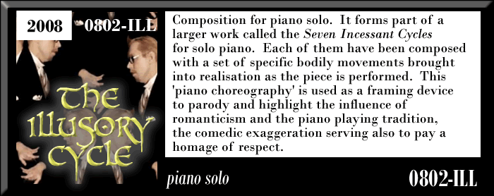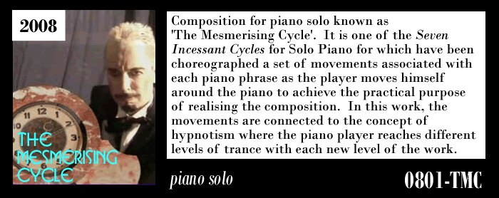 NOTES: Composition for piano solo known as 'The Mesmerising Cycle'. It is one of the SEVEN INCESSANT CYCLES for Solo Piano for which have been choreographed a set of movements associated with each piano phrase as the player moves himself around the piano to achieve the practical purpose of realising the composition. In this work, the movements are connected to the concept of hympnotism where the piano player reaches difference levels of trance with eah new level providing a new insight into the piano player's 'past'; memory, even when recalled through processes like hypnotism, is an unreliable and unthruthful mistress .